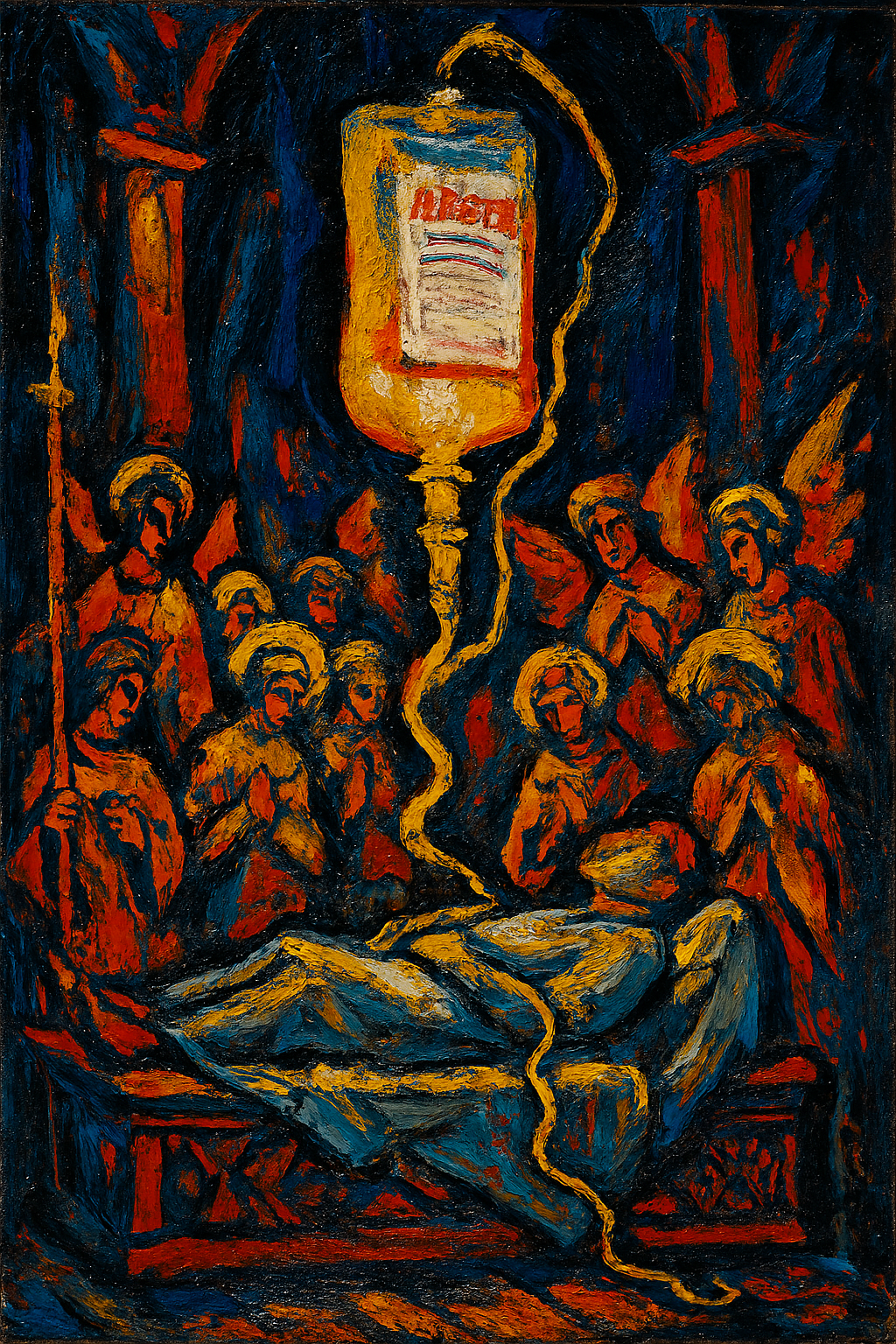 الأنابيب الوريدية لم تعد أدوات طبية، بل أسلاك نور مشتعلة، تربط الجسد بالسماء، وتحوّل الألم إلى طقس مقدّس.