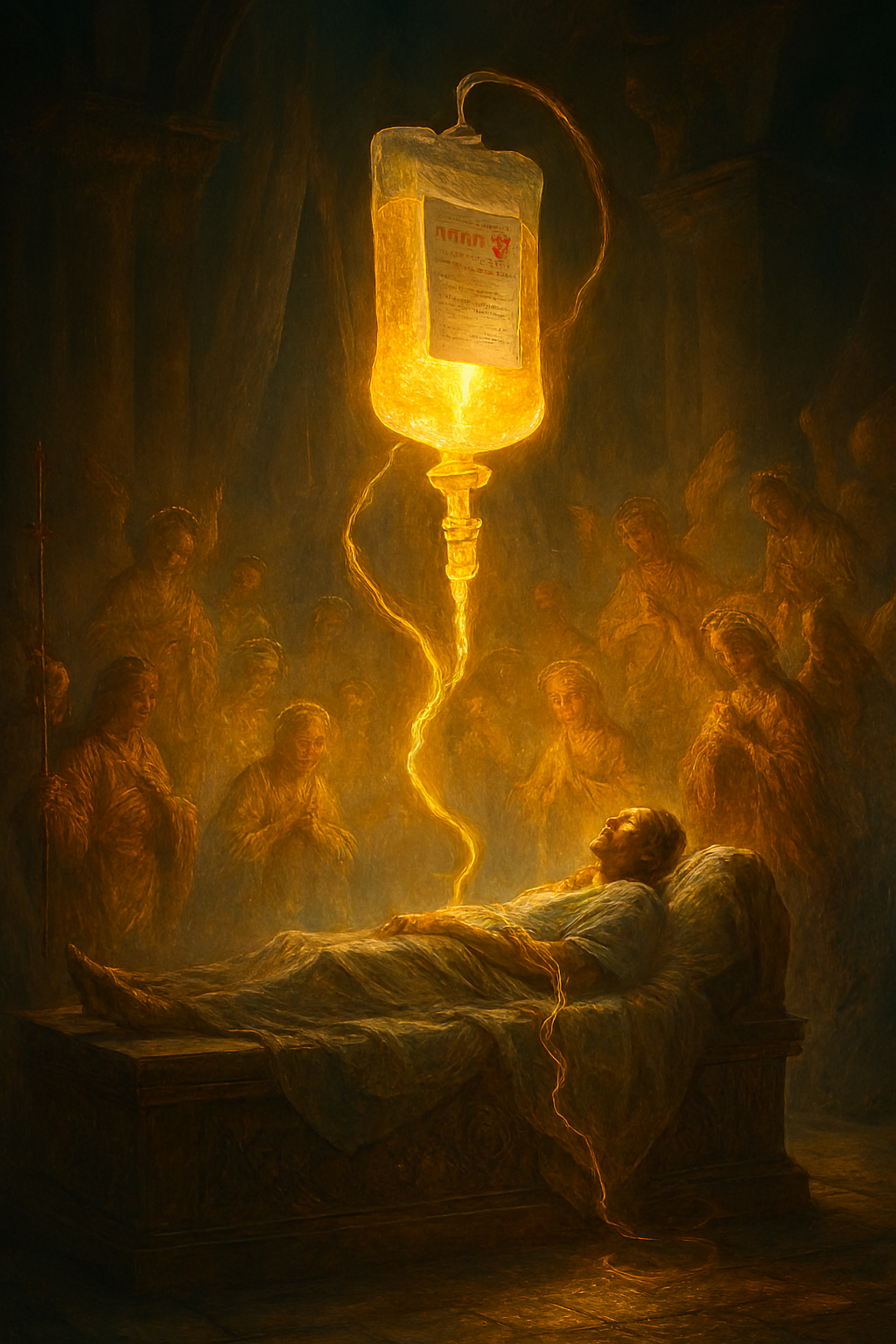 تخيّل غرفة العلاج وقد تحوّلت إلى معبد للشفاء، حيث تتدلى كيس الديكستروز من السماء كأنه كأس من نور ذهبي، يقطر في عروق المريض عبر خيوط ذهبية تشبه كرومًا سماوية. المريض مستلقٍ على منصة حجرية مزخرفة، كأنها مذبح الرحمة، تحيط به ملائكة بوجوه هادئة وأجنحة مضيئة، يهمسون بدعوات الشفاء.