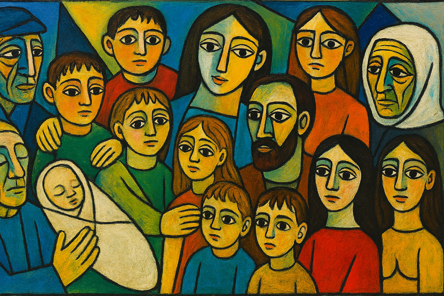 لقد صُممت بأسلوب تكعيبي مستوحى من بيكاسو، حيث تتوزع العائلة الكبيرة في تكوين أفقي يملأ مساحة اللوحة بألوان جريئة وأشكال هندسية متداخلة.