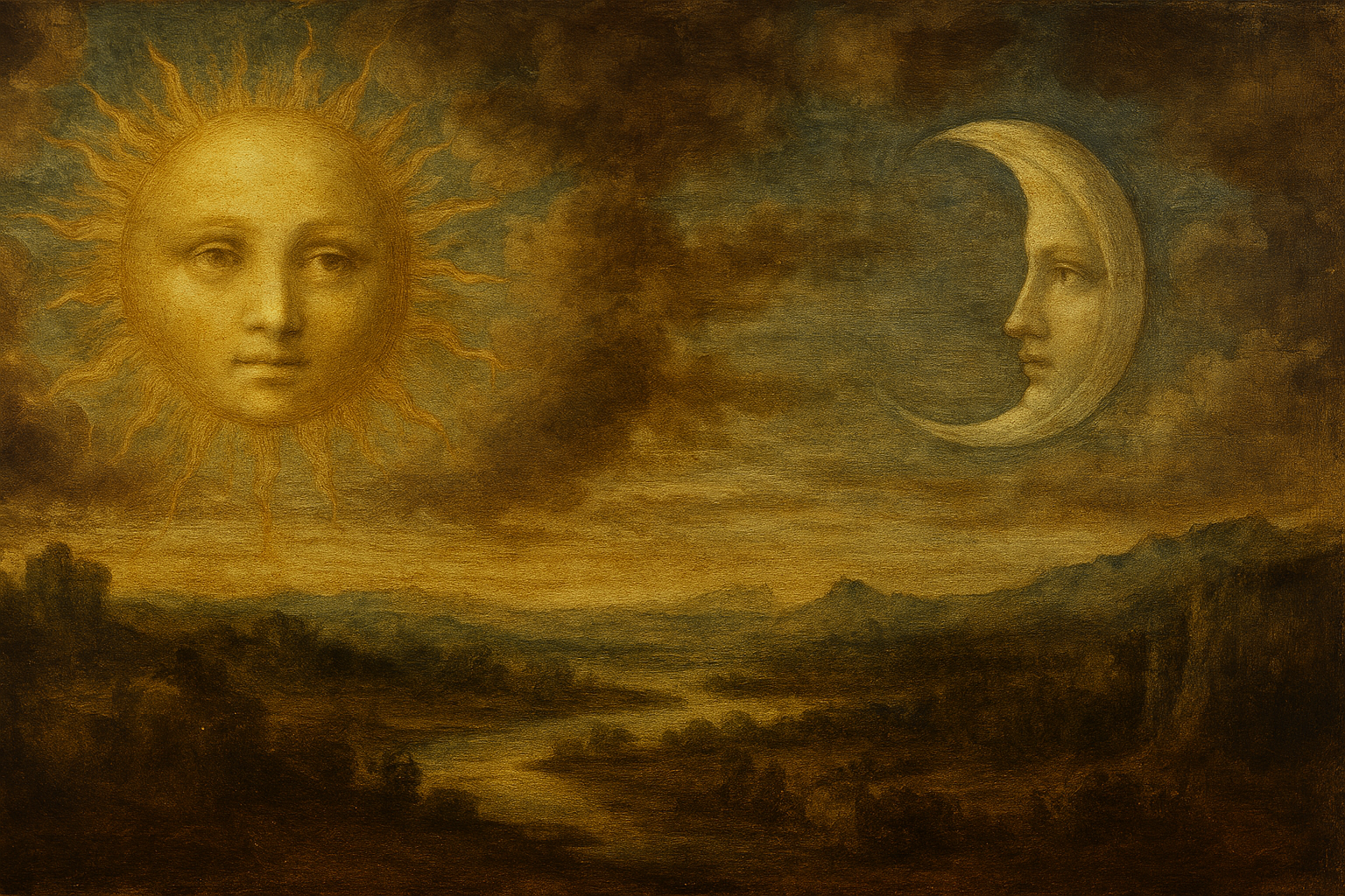 اللوحة بأسلوب عصر النهضة وبريشة دافنشي، حيث يتقابل النور الذهبي للشمس مع البهاء الفضي للقمر في مشهد رمزي يجمع بين النهار والليل.